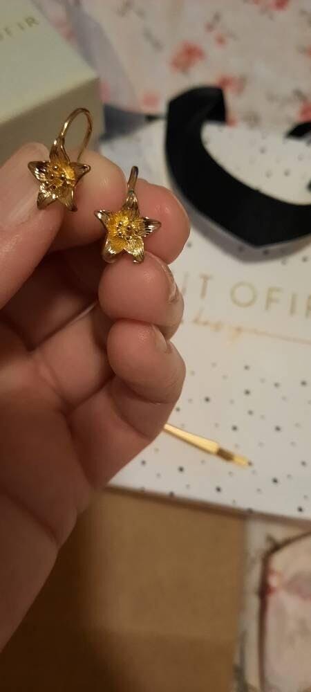 Blossom Earrings – A pair of flower-shaped hanging earrings.