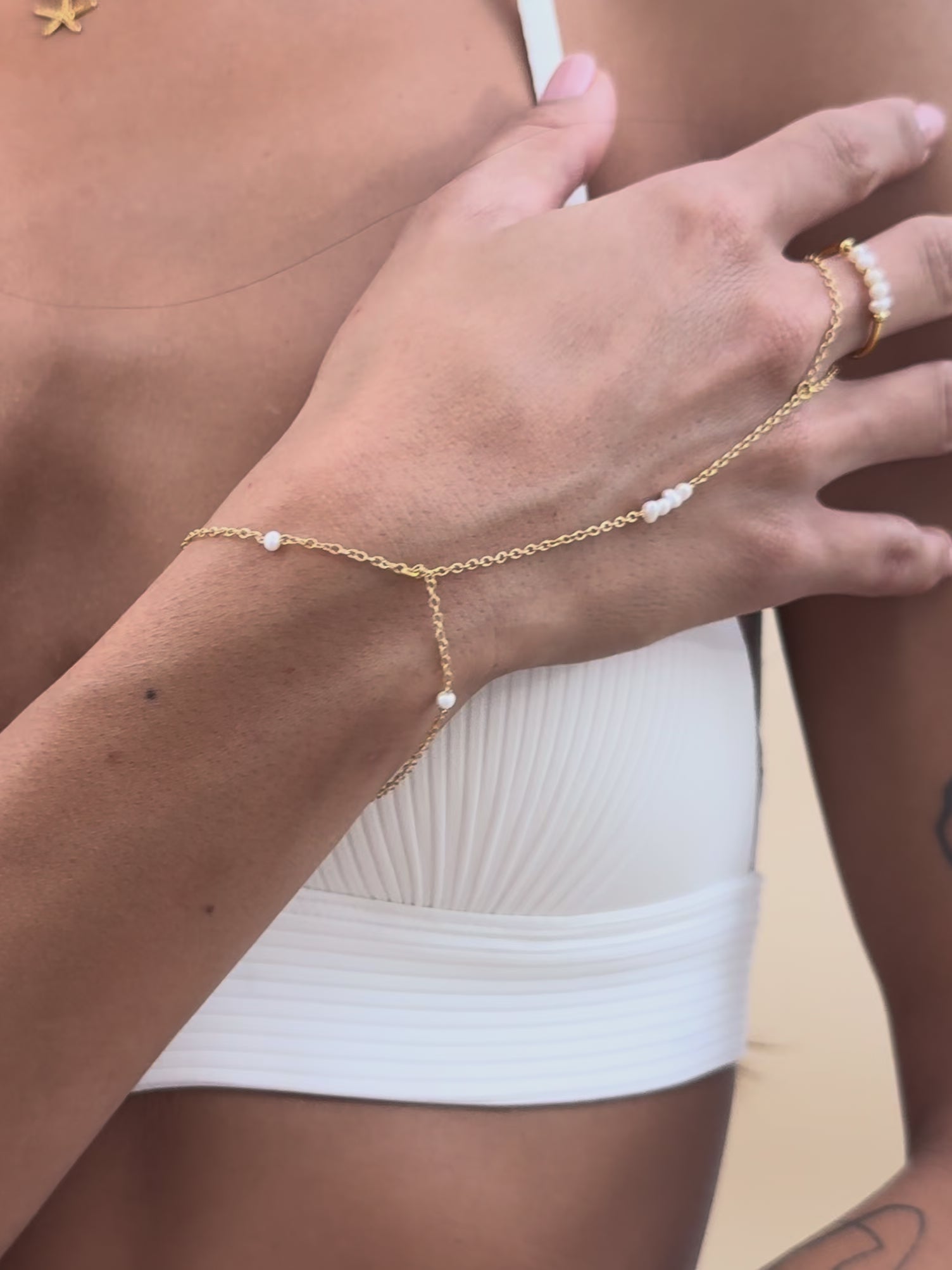 A delicate statement that turns heads in the most effortless way. This dainty chain bracelet connects to your finger and features natural pearls that sit beautifully along the hand for a look that’s soft, stylish, and totally unique.