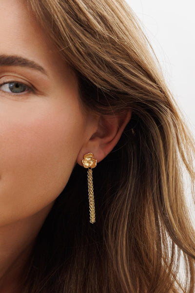 Featuring floral designs with elegant dangling chains, these earrings are crafted from brass with your choice of gold or rhodium plating. They are nickel-free, making them ideal for sensitive skin. Plus, they come in our branded packaging and include a one-year warranty—because we've got your back.