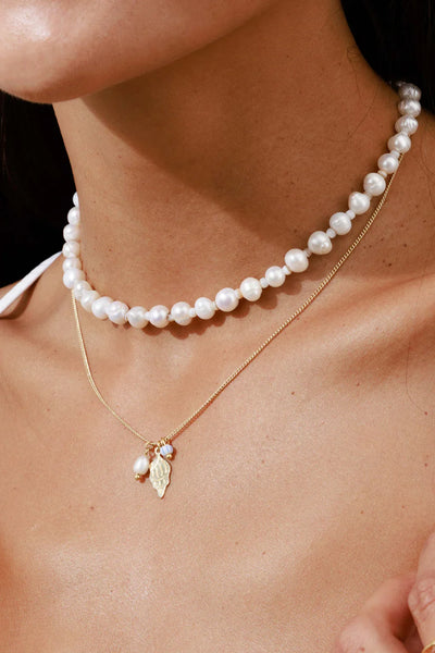 The Lana Necklace is a short strand with a natural, just-right vibe — a clean combo of natural pearls and a tiny shell charm that brings all the ocean magic to your look.