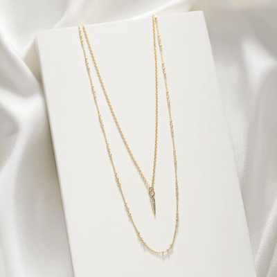 The double chain necklace with an embedded triangular pendant combines an impressive design with a unique look. The option to add an extension chain gives you the freedom to adjust it perfectly to your style.