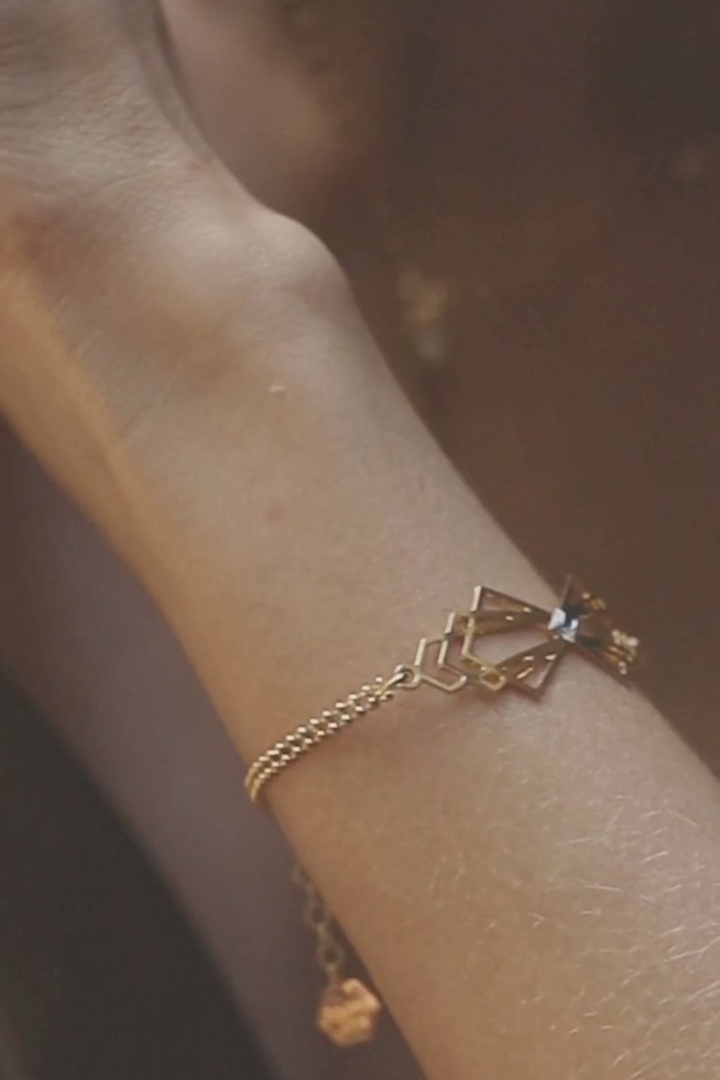 Metro Bracelet – A stunning and unique bracelet comprised of a central geometric element with a Swarovski crystal in it's center and ball chains on both sides.